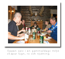 I vårt timmerhus är stämningenhemtrevlig och avslappnad.